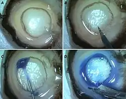 Fig 2 : Pre-Descemet's endothelial keratoplasty (PDEK). A, B: A 30 gauge needle is introduced into the centre of the cornea and air is injected. A big bubble is formed in the donor cornea on the endothelial side and it is pierced with Knife. C, D: Graft is stained or coloured by Trypan blue dye and dissected out.