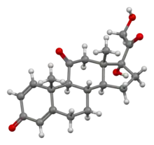 Prednisone is a synthetic glucocorticoid used for its anti-inflammatory and immunosuppressive properties.[37][38] Prednisone is a prodrug; it is metabolised in the liver by 11-β-HSD to prednisolone, the active drug. Prednisone has no substantial biological effects until converted via hepatic metabolism to prednisolone.[39]