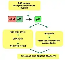 PIF also has a series of anti-apoptotic impacts in human extravillous trophoblasts, mediated by the TP53 gene.[14] Apoptosis is a controlled cell death process that must not occur if a cell is to proliferate. PIF has specific anti-apoptotic impacts by reducing the phosphorylation of the p53 protein at the serine-15 residue. Without phosphorylation p53 is unstable and undergoes ubiquitylation, signalling the trophoblast and endometrial cells to degrade it in proteasomes and attenuating downstream apoptotic effects. PIF, in particular, has been correlated with increasing the expression of anti-apoptotic effector BCL2 and decreasing the expression of pro-apoptotic effector BAX.[14] BCL2, which is upregulated by PIF, ensures that cytochrome c remains within the inner mitochondrial membrane and hence does not trigger the production of an apoptosome in the cell cytosol. BAX, which is downregulated by PIF, produces transmembrane transport channels that liberate cytochrome c, triggering apoptosis. Collectively, these biochemical effects show that PIF signals against the internal mechanisms of apoptosis in extravillous trophoblast cells, allowing them to proliferate before they implant into the uterine wall.