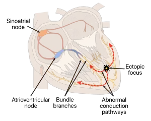 An illustration of ectopic foci near papillary muscles in the left ventricle. Ectopic foci can be located anywhere in the ventricles in the case of PVCs.