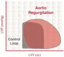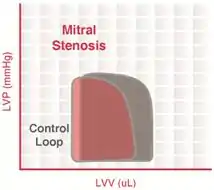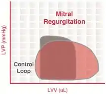 There is also no true period of isovolumic relaxation because some LV blood flows back into the left atrium through the leaky mitral valve. During ventricular diastolic filling, the elevated atrial pressure is transmitted to the LV during filling so that LV end-diastolic volume (and pressure) increases. This would cause the afterload to increase if it were not for the reduced outflow resistance (due to mitral regurgitation) that tends to decrease afterload during ejection. The net effect of these changes is that the width of the PV loop is increased (i.e., ventricular stroke volume is increased). However, ejection into the aorta (forward flow) is reduced. The increased ventricular stroke volume in this case includes the volume of blood ejected into the aorta as well as the volume ejected back into the left atrium.