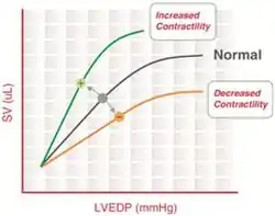 Frank–Starling curves can be used as an indicator of muscle contractility (inotropy). However, there is no single Frank–Starling curve on which the ventricle operates but rather a family of curves, each of which defined by the afterload and inotropic state of the heart. Increased afterload or decreased inotropy shifts the curve down and to the right. Decreased afterload and increased inotropy shifts the curve up and to the left.