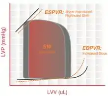 Ventricular stroke work (SW) is defined as the work performed by the left or right ventricle to eject the stroke volume into the aorta or pulmonary artery, respectively. The area enclosed by the PV loop is a measure of the ventricular stroke work, which is a product of the stroke volume and the mean aortic or pulmonary artery pressure (afterload), depending on whether one is considering the left or the right ventricle.
