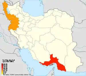Female genital mutilation (FGM), also known as female genital cutting (FGC), female genital mutilation/cutting (FGM/C) and female circumcision,[lower-alpha 1] is practiced in 30 countries in western, eastern, and north-eastern Africa,[3] in parts of the Middle East[4][5] and Asia,[6][7] and within some immigrant communities in Europe, North America and Australia.[3][8][9] The WHO defines the practice as "all procedures that involve partial or total removal of the external female genitalia, or other injury to the female genital organs for non-medical reasons."[10]