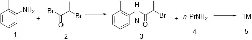 The amidation between o-toluidine [95-53-4] (1) and 2-bromopropionyl bromide [563-76-8] (2) leads to 2-bromo-N-(2-methylphenyl)propanamide [19397-79-6] (3). Displacement of the remaining halide with propylamine [107-10-8] (4) completed the synthesis of prilocaine (5).