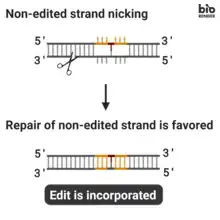 Despite its increased efficacy, the edit inserted by PE2 might still be removed due to DNA mismatch repair of the edited strand. To avoid this problem during DNA heteroduplex resolution, an additional single guide RNA (sgRNA) is introduced. This sgRNA is designed to match the edited sequence introduced by the pegRNA, but not the original allele. It directs the Cas9 nickase portion of the fusion protein to nick the unedited strand at a nearby site, opposite to the original nick. Nicking the non-edited strand causes the cell's natural repair system to copy the information in the edited strand to the complementary strand, permanently installing the edit.[1] However, there are drawbacks to this system as nicking the unaltered strand can lead to additional undesired indels. [8]