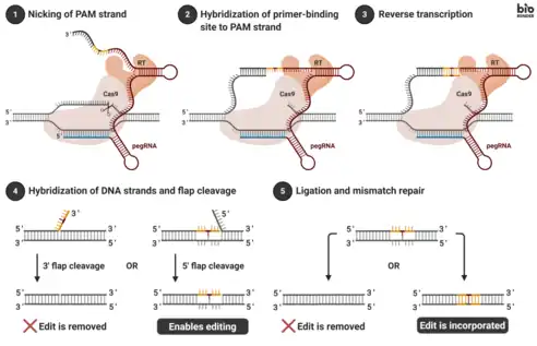 Prime editing is a 'search-and-replace' genome editing technology in molecular biology by which the genome of living organisms may be modified. The technology directly writes new genetic information into a targeted DNA site. It uses a fusion protein, consisting of a catalytically impaired Cas9 endonuclease fused to an engineered reverse transcriptase enzyme, and a prime editing guide RNA (pegRNA), capable of identifying the target site and providing the new genetic information to replace the target DNA nucleotides. It mediates targeted insertions, deletions, and base-to-base conversions without the need for double strand breaks (DSBs) or donor DNA templates.[1]
