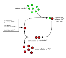 The first hypothesis that tried to explain how prions replicate in a protein-only manner was the heterodimer model.[52] This model assumed that a single PrPSc molecule binds to a single PrPC molecule and catalyzes its conversion into PrPSc. The two PrPSc molecules then come apart and can go on to convert more PrPC. However, a model of prion replication must explain both how prions propagate, and why their spontaneous appearance is so rare. Manfred Eigen showed that the heterodimer model requires PrPSc to be an extraordinarily effective catalyst, increasing the rate of the conversion reaction by a factor of around 1015.[53] This problem does not arise if PrPSc exists only in aggregated forms such as amyloid, where cooperativity may act as a barrier to spontaneous conversion. What is more, despite considerable effort, infectious monomeric PrPSc has never been isolated.
