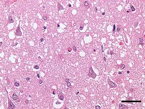 | Micrograph showing spongiform degeneration (vacuoles that appear as holes in tissue sections) in the cerebral cortex of a patient who had died of a prion disease (Creutzfeldt-Jakob disease). H&E stain. Scale bar = 30 microns (0.03 mm). | |