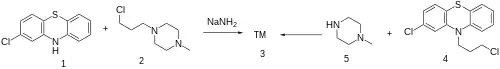 The alkylation of 2-chlorophenothiazine (1) and 1-(3-Chloropropyl)-4-methylpiperazine [104-16-5] (2) in the presence of sodamide gives Prochlorperazine (3); or by alkylation of 2-Chloro-10-(3-chloropropyl)phenothiazine [2765-59-5] (4) and 1-methylpiperazine (5).