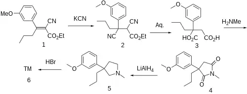 The Knoevenagel condensation between 3'-Methoxybutyrophenone [21550-06-1] and Ethyl cyanoacetate gives (1). Conjugate addition of cyanide gives (2). Hydrolysis of both nitrile groups, saponification of the ester and decarboxylation gives the diacid, CID:164137621 (3). Imide formation occurs upon treatment with methylamine giving 3-(3-Methoxyphenyl)-1-methyl-3-propylpyrrolidine-2,5-dione, CID:163444474 (4). Reduction of the imide by lithium aluminium hydride gave [1505-32-4][29369-01-5] (5). Demethylation completed the synthesis of Profadol (6).