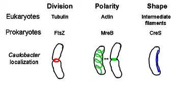 Crescentin (encoded by creS gene) is an analogue of eukaryotic intermediate filaments (IFs). Unlike the other analogous relationships discussed here, crescentin has a rather large primary homology with IF proteins in addition to three-dimensional similarity - the sequence of creS has a 25% identity match and 40% similarity to cytokeratin 19 and a 24% identity match and 40% similarity to nuclear lamin A. Furthermore, crescentin filaments are roughly 10 nm in diameter and thus fall within diameter range for eukaryal IFs (8-15 nm).[23] Crescentin forms a continuous filament from pole to pole alongside the inner, concave side of the crescent-shaped bacterium Caulobacter crescentus. Both MreB and crescentin are necessary for C. crescentus to exist in its characteristic shape; it is believed that MreB molds the cell into a rod shape and crescentin bends this shape into a crescent.[1]
