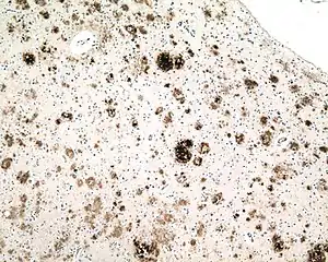 | Micrograph of a section of the cerebral cortex from a person with Alzheimer's disease, immunostained with an antibody to amyloid beta (brown), a protein fragment that accumulates in amyloid plaques and cerebral amyloid angiopathy. 10X microscope objective. |