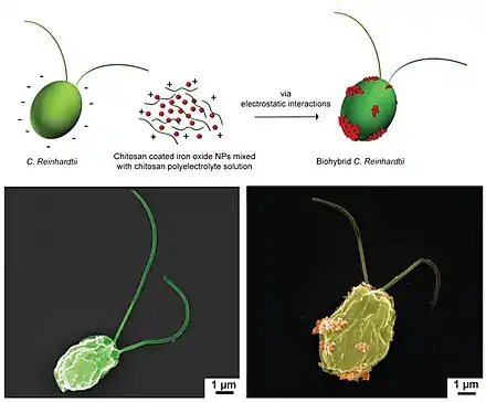 Chlamydomonas reinhardtii is a unicellular green microalga. The wild-type C. reinhardtii has a spherical shape that averages about 10 µm in diameter.[141] This microorganism can perceive the visible light and be steered by it (i.e., phototaxis) with high swimming speeds in the range of 100–200 µm s−1.[129] It has natural autofluorescence that permits label-free fluorescent imaging.[141] C. reinhardtii has been actively explored as the live component of biohybrid microrobots for the active delivery of therapeutics.[129] They are biocompatible with healthy mammalian cells, leave no known toxins, mobile in the physiologically relevant media, and allow for surface modification to carry cargo on the cell wall.[129][142][143][144][145] Alternative attachment strategies for C. reinhardtii have been proposed for the assembly through modifying the interacting surfaces by electrostatic interactions[129][142] and covalent bonding.[146] [119]