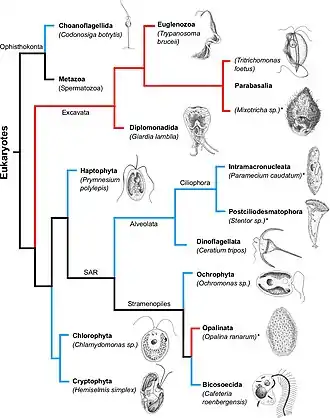 In the phylogenetic tree on the right, aquatic organisms (living in marine, brackish, or freshwater environments) have their branches drawn in blue while parasitic organisms have their branches drawn in red. Ciliates are indicated by an asterisk after their names. For each phylum marked in bold font, a representative organism has been sketched next to its name.[2]