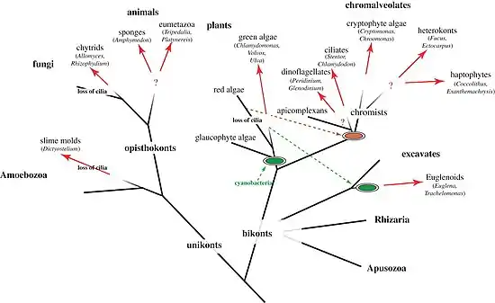 Cryptophytes | All dinoflagellates and nanoflagellates (choanoflagellates, silicoflagellates, most green algae)[12][13] (Other protists go through a phase as gametes when they have temporary flagellum – some radiolarians, foraminiferans and Apicomplexa) | ||