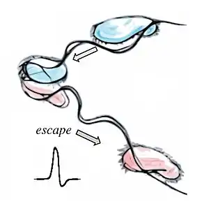 In flagellate algae, abrupt changes in light intensity or intense photic stimuli induce rapid flagellar reversal and transient backward swimming.[94][95] In green algae, this action may be mediated by the contractile root fibre which alters the angle between basal bodies.[96] Cells can also react at speed to unexpected mechanical stimuli. All-or-none contractions in the stalked ciliate Vorticella can occur at rates of 8 cm s−1.[97] In some species of heliozoa, axopods can completely retract within 20 ms in order to draw in trapped prey for phagocytosis.[97][98][93]