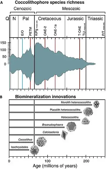 (A) coccolithophore species richness over time combining heterococcoliths and nannoliths.[125] Q, Quaternary; N, Neogene; Pal, Paleogene; E/O, Eocene/Oligocene glacial onset event; PETM, Paleocene/Eocene thermal maximum warming event; K/Pg, Cretaceous/Paleogene; OAE, oceanic anoxic event; T-OAE, Toarcian oceanic anoxic event; T/J, Triassic/Jurassic; P/T, Permian/Triassic; mass ext., mass extinction.[124]