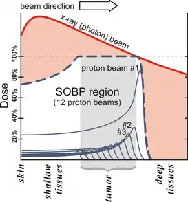 In most treatments, protons of different energies with Bragg peaks at different depths are applied to treat the entire tumor. These Bragg peaks are shown as thin blue lines in the figure in this section. It is important to understand that, while tissues behind (or deeper than) the tumor get almost no radiation, the tissues in front of (shallower than) the tumor get radiation dosage based on the SOBP.
