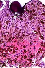 Micrograph of a psammomatous melanotic schwannoma with a psammoma body, as may be seen in Carney complex. H&E stain.