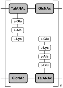 Pseudopeptidoglycan is composed of two sugars, N-acetylglucosamine and N-acetyltalosaminuronic acid. These sugars are made of different amino acids, and the peptide cross-links within pseudopeptidoglycan are formed with different amino acids. The peptide bond is formed between the lysine of a N-acetyltalosaminuronic acid and a glutamine of a parallel N-acetyltalosaminuronic acid.[6] Pseudopeptidoglycan, like peptidoglycan in bacteria, forms a mesh-like layer outside of the plasma membrane of the archaea.