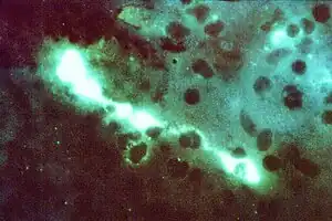 | Direct fluorescent antibody stain of a mouse brain impression smear showing C. psittaci | |