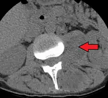 An abscess in the psoas muscle of the abdomen may be caused by lumbar tuberculosis. Owing to the proximal attachments of the iliopsoas, such an abscess may drain inferiorly into the upper medial thigh and present as a swelling in the region. The sheath of the muscle arises from the lumbar vertebrae and the intervertebral discs between the vertebrae. The disc is more susceptible to infection, from tuberculosis and Salmonella discitis. The infection can spread into the psoas muscle sheath.[1]