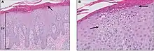 If the clinical diagnosis is uncertain, a skin biopsy or scraping may be performed to rule out other disorders and to confirm the diagnosis. Skin from a biopsy shows clubbed epidermal projections that interdigitate with dermis on microscopy. Epidermal thickening is another characteristic histologic finding of psoriasis lesions.[16][58] The stratum granulosum layer of the epidermis is often missing or significantly decreased in psoriatic lesions; the skin cells from the most superficial layer of skin are also abnormal as they never fully mature. Unlike their mature counterparts, these superficial cells keep their nuclei.[16] Inflammatory infiltrates can typically be seen on microscopy when examining skin tissue or joint tissue affected by psoriasis. Epidermal skin tissue affected by psoriatic inflammation often has many CD8+ T cells, while a predominance of CD4+ T cells makes up the inflammatory infiltrates of the dermal layer of skin and the joints.[16]