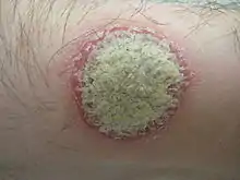 Psoriatic plaque, showing a silvery center surrounded by a reddened border