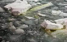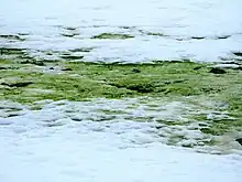 Microscopic algae that can tolerate extremely cold temperatures can survive in snow, ice, and very cold seawater. On snow, cold-tolerant algae can bloom on the snow surface covering land, glaciers, or sea ice when there is sufficient light. These snow algae darken the surface of the snow and can contribute to snow melt.[18] In seawater, phytoplankton that can tolerate both very high salinities and very cold temperatures are able to live in sea ice. One example of a psychrophilic phytoplankton species is the ice-associated diatom Fragilariopsis cylindrus.[19] Phytoplankton living in the cold ocean waters near Antarctica often have very high protein content, containing some of the highest concentrations ever measured of enzymes like Rubisco.[20]