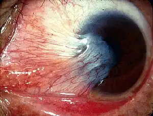 A pterygium of the eye (plural pterygia or pterygiums, also called surfer's eye) is a pinkish, roughly triangular tissue growth of the conjunctiva onto the cornea of the eye.[2] It typically starts on the cornea near the nose.[3] It may slowly grow but rarely grows so large that it covers the pupil and impairs vision.[2] Often both eyes are involved.[5]