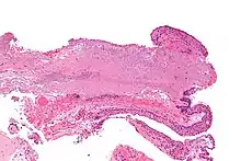 Micrograph of a conjunctiva associated with prominent blood vessels (left-bottom of image) and elastotic collagen (centre of image), as may be seen in a pterygium. H&E stain.