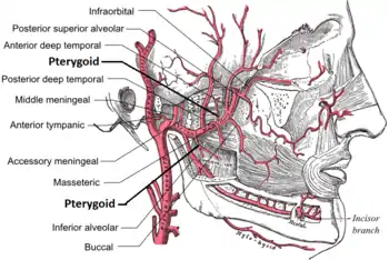 Plan of branches of internal maxillary artery. (Pterygoid labeled at center top.)