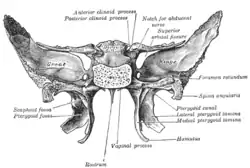 ![]() Sphenoid bone. Upper and posterior surfaces. (Pterygoid fossa labeled at left.) | |