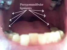 The pterygomandibular raphe (pterygomandibular ligament) is a thin[1] tendinous band of buccopharyngeal fascia. It is attached superiorly to the pterygoid hamulus of the medial pterygoid plate, and inferiorly to the posterior end of the mylohyoid line of the mandible. It gives attachment to the buccinator muscle (in front), and the superior pharyngeal constrictor muscle (behind).