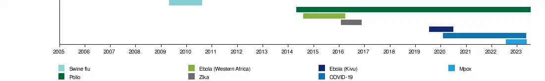 Multiple surveillance and response systems exist worldwide for the early detection and effective response to contain the spread of disease. Time delays occur for two main reasons. The first is the delay between the first case and the confirmation of the outbreak by the healthcare system, allayed by good surveillance via data collection, evaluation, and organisation. The second is when there is a delay between the detection of the outbreak and widespread recognition and declaration of it as an international concern.[4] The declaration is promulgated by an emergency committee (EC) made up of international experts operating under the IHR (2005),[3] which was developed following the SARS outbreak of 2002–2003.[4] Between 2009 and 2016, there were four PHEIC declarations.[14] The fifth was the 2018–2020 Kivu Ebola epidemic, declared in July 2019 and ended in June 2020.[6] The sixth was the COVID-19 pandemic, declared in January 2020 and ended in May 2023.[15] The seventh was the 2022–2023 mpox outbreak, declared in July 2022 and ended in May 2023.[8] Under the 2005 International Health Regulations (IHR), states have a legal duty to respond promptly to a PHEIC.[2]