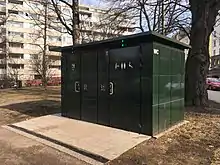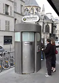 Many public toilets are permanent small buildings visible to passers-by on the street. Others are underground, including older facilities in Britain and Canada. Contemporary street toilets include automatic, self-cleaning toilets in self-contained pods; an example is the Sanisette, which first became popular in France.[4] An Indian version of these automated toilet pods, remotely monitored by sensors, are the Electronic Public Toilets or eToilets; they have proliferated across the country since 2014, as part of Swachh Bharat Abhiyan, the campaign launched that year to end open defecation.[5]