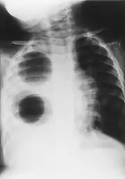 Pulmonary agenesis is an inborn lung underdevelopment that is rare and potentially lethal.[1] The disorder is caused by a complete developmental arrest of the primitive lung during embryonic life, and it is often associated with other developmental defects.[2] Bilateral and unilateral pulmonary agenesis are classified, depending on whether one side of the lung or both sides are affected. Bilateral pulmonary agenesis is lethal, while the mortality rate of unilateral pulmonary agenesis is higher than 50%.[3] Depending on the severity, the symptom ranges from none to various respiratory complaints.[4] It is detectable prenatally, however, its nonspecific clinical features act as the obstacle for diagnosing.[2] The exact cause of pulmonary agenesis is still obscure. However, theories have been raised regarding the vascular, iatrogenic, viral and genetic causes of pulmonary agenesis in an attempt to explain the pathogenesis of the disorder.[5] In most cases of pulmonary agenesis, surgical resection is performed to remove the malformed lobe or the entire defected lung of the patient depending on the severity of the respiratory impairment.[6]