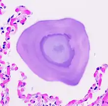PAM may be confined to certain areas or show diffuse distribution through the lungs.[6] Lung biopsy and autopsy specimens demonstrate characteristic intra-alveolar lamellar microliths.[6][15] Calcium deposits in the alveoli begin in the lower lobes and spread over a period of years throughout the lungs.[3]