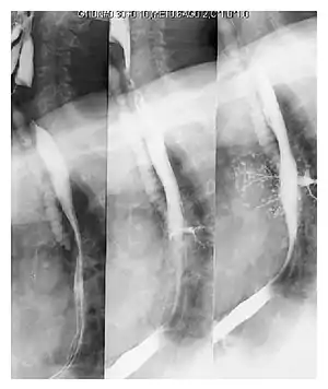 | Upper gastrointestinal series at the level of the esophagus, showing pulmonary aspiration of the radiocontrast agent | |