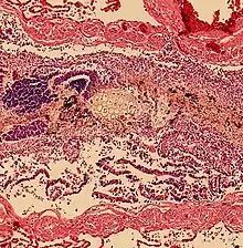 Pulmonary aspiration of acidic material (such as stomach acid) may produce an immediate primary injury caused by the chemical reaction of acid with lung parenchyma, and a later secondary injury as a result of the subsequent inflammatory response.[2]