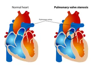 Pulmonary valve stenosis (PVS) is a heart valve disorder. Blood going from the heart to the lungs goes through the pulmonary valve, whose purpose is to prevent blood from flowing back to the heart. In pulmonary valve stenosis this opening is too narrow, leading to a reduction of flow of blood to the lungs.[1][5]