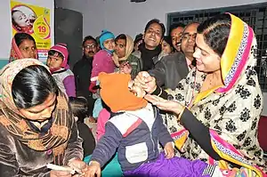 Actor Amitabh Bachchan volunteered with the campaign, filming TV and radio spots urging against complacency[4][9] and personally vaccinating children.[10]