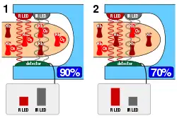 A typical pulse oximeter uses an electronic processor and a pair of small light-emitting diodes (LEDs) facing a photodiode through a translucent part of the patient's body, usually a fingertip or an earlobe. One LED is red, with wavelength of 660 nm, and the other is infrared with a wavelength of 940 nm. Absorption of light at these wavelengths differs significantly between blood loaded with oxygen and blood lacking oxygen. Oxygenated hemoglobin absorbs more infrared light and allows more red light to pass through. Deoxygenated hemoglobin allows more infrared light to pass through and absorbs more red light. The LEDs sequence through their cycle of one on, then the other, then both off about thirty times per second which allows the photodiode to respond to the red and infrared light separately and also adjust for the ambient light baseline.[32]
