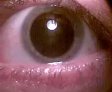 In humans, the pupil is round, but its shape varies between species; some cats, reptiles, and foxes have vertical slit pupils, goats have horizontally oriented pupils, and some catfish have annular types.[3] In optical terms, the anatomical pupil is the eye's aperture and the iris is the aperture stop. The image of the pupil as seen from outside the eye is the entrance pupil, which does not exactly correspond to the location and size of the physical pupil because it is magnified by the cornea. On the inner edge lies a prominent structure, the collarette, marking the junction of the embryonic pupillary membrane covering the embryonic pupil.