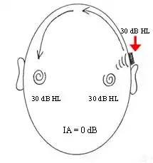A reduction or loss of energy occurs with cross hearing, which is referred to as interaural attenuation (IA) or transcranial transmission loss.[13] IA varies with transducer type. It varies from 40 dB to 80 dB with supra-aural headphones. However, with insert earphones it is in the region of 55 dB. The use of insert earphones reduces the need for masking, due to the greater IA which occurs when they are used (See Figure 1).[14]