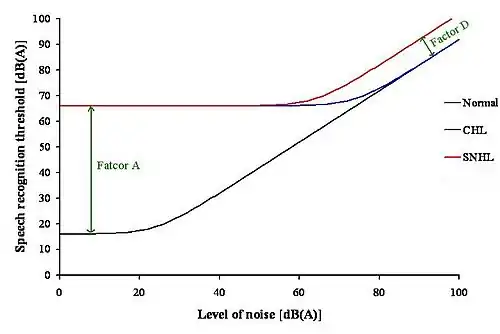 Speech recognition threshold (SRT) is defined as the sound pressure level at which 50% of the speech is identified correctly. For a person with a conductive hearing loss (CHL) in quiet, the SRT needs to be higher than for a person with normal hearing. The increase in SRT depends on the degree of hearing loss only, so Factor A reflects the audiogram of that person. In noise, the person with a CHL has the same problem as the person with normal hearing (See Figure 10).[20]