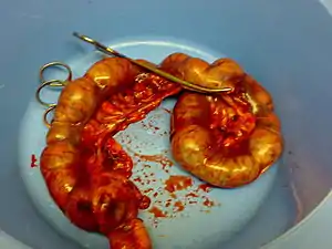 | A canine pyometric uterus immediately after surgery to remove it. It is extremely distended with purulent material. | |
