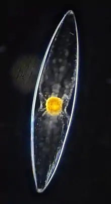 P. fusiformis's name is derived from its tapered or spindle shape.[2] P. fusiformis is non-motile, which is a characteristic of all members of family Pyrocystaceae, which lose their flagellum by the time these organisms are adults.[2] P. fusiformis is considered a large dinoflagellate,[3][4] with each cell being approximately 970 x 163 µm long and having a spherical diameter of 374 µm.[5] The cell's chloroplasts actually change the cell's shape as they move closer to the cell's wall in daytime and retract towards the nucleus at night.[5]P. fusiformis is autotrophic, deriving their energy from the sun through photosynthesis.[6] P. fusiformis will only photosynthesize during daylight hours and mostly produce bioluminescence during night because of their circadian rhythm which controls both processes.[7]