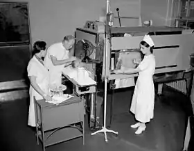 ![]() Patient being treated with "fever therapy" in a Kettering hypertherm cabinet, U.S. Marine Hospital, New Orleans, 1937 | |
